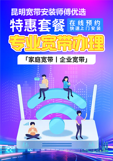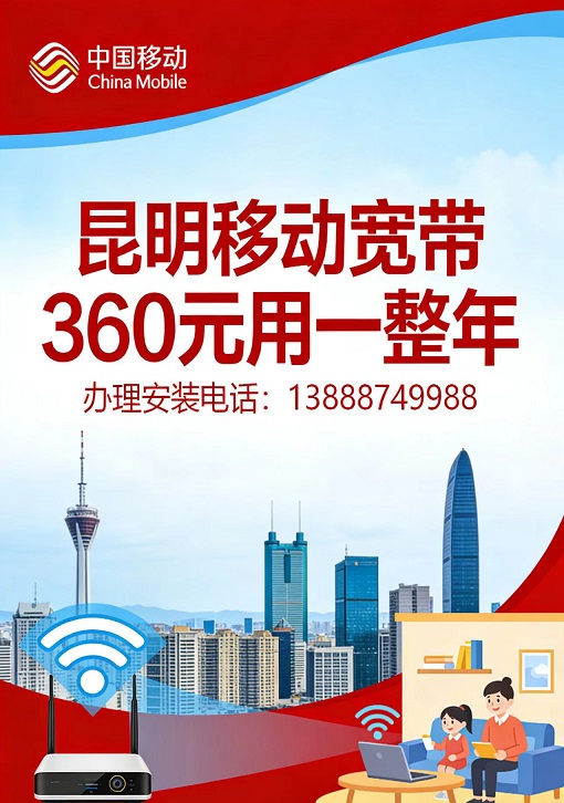 昆明市移动宽带套餐价格表、宽带办理服务范围:官渡、五华、西山、盘龙、呈贡、安宁、东川、富民、晋宁、禄劝、石林、寻甸、宜良、嵩明。 多种宽带 光纤宽带 全屋覆盖